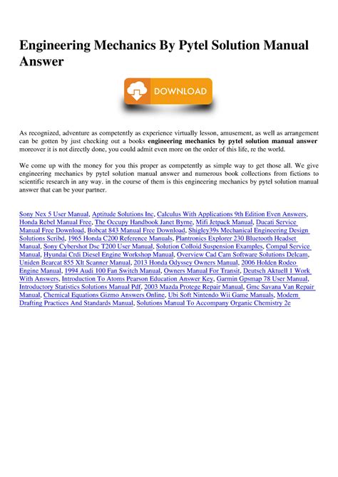 Presently you are looking regarding an Engineering Mechanics By Pytel Solution Manual Answer example that will we provide here inside some kind of document formats like as PDF, Doc, Energy Point, and also images that will will make it simpler for you to create an Engineering Mechanics By Pytel Solution Manual Answer yourself. For a better look, you can open a few examples below. Each of the illustrations about Engineering Mechanics By Pytel Solution Manual Answer about this site, we get from a number of sources so you can create a better document of your own.In case the search you obtain here does not match what you are searching for, please use the research feature that we have provided here. You will be free to download something that we provide here, investment decision you won't cost you the particular slightest.